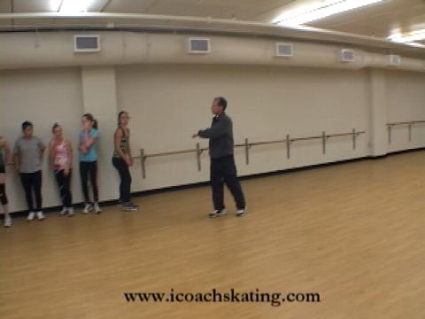 Next Nick has the class do off-ice waltz jumps. He addresses common problems to avoid, including running sideways. The feet must be pointed forward to run properly. Other errors include running on tip toes, letting the shoulders twist, and lack of curve on the run-up. Nick also discusses proper arm movement for this drill.